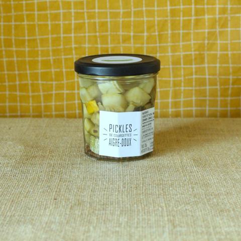 Courgettes*(50%), Eau, Vinaigre*, Sucre*, Graines de coriandre, Cannelle, Feuilles de laurier, Sel.