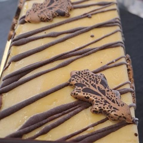 composée d'une génoise imbibée à la vanille, d'une crème glacée au caramel beurre salé et d'un sorbet poire