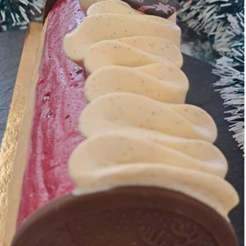 Bûche glacée composée d'un sherbet à la framboise, d'une glace au nougat de Montélimar et d'une crème glacée à la Vanille de Madagascar sur une génoise vanille