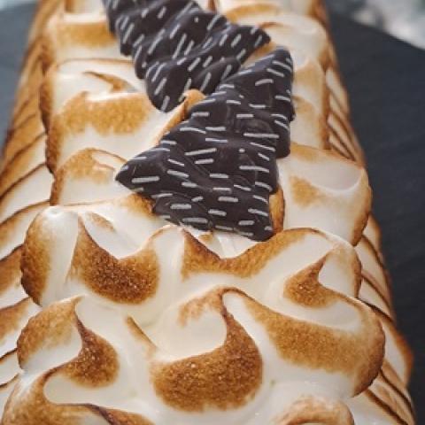 Omelette norvégienne rhum raisins composée d'une glace au rhum avec des raisins macérés dans le rhum, le tout enveloppé d'une meringue à l'italienne, et posé sur une génoise imbibée avec un sirop au rhum