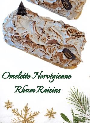 Omelette norvégienne rhum raisins composée d'une glace au rhum avec des raisins macérés dans le rhum, le tout enveloppé d'une meringue à l'italienne, et posé sur une génoise imbibée avec un sirop au rhum
