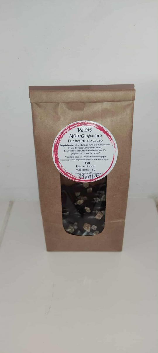 fèves de cacao bio, sucre de canne bio, beurre de cacao bio, lécithine de tournesol bio, gingembre confit; (gingembre, sucre, sirop de glucose)