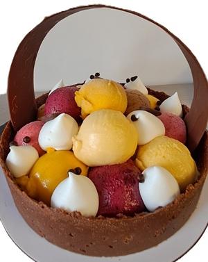 Composition : chocolat, feuilletine, praliné, sorbets aux fruits, chantilly