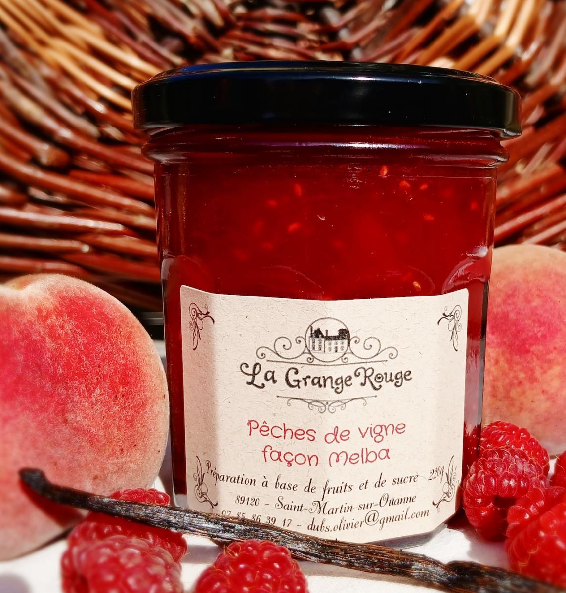 C'est à la fin du XIXème siècle que le grand Escoffier met au point la fameuse pêche Melba, en hommage à la cantatrice Nellie Melba. Je me suis amusé à la conjuguer en confiture et le résultat fera chanter les gourmandes et les gourmands ! Les pêches de vigne Madeleine de Courson sont accompagnées de quelques pêches vineuses, le duo nous chante ainsi des notes "amande-noyau" et "beurrées". Pour rester dans ces accords, j'ai misé sur la saveur d'amande amère de l'Amaretto et la fraîcheur du citron vert. Suivant le schéma de la recette du célèbre dessert, une belle gousse de vanille de Zanzibar habille le tout sans rien cacher. Quelques framboises jouent en contrepoint, avec leur acidité et leur puissance fruitée. Cette confiture est une symphonie de saveurs, toute en harmonie et en équilibre.