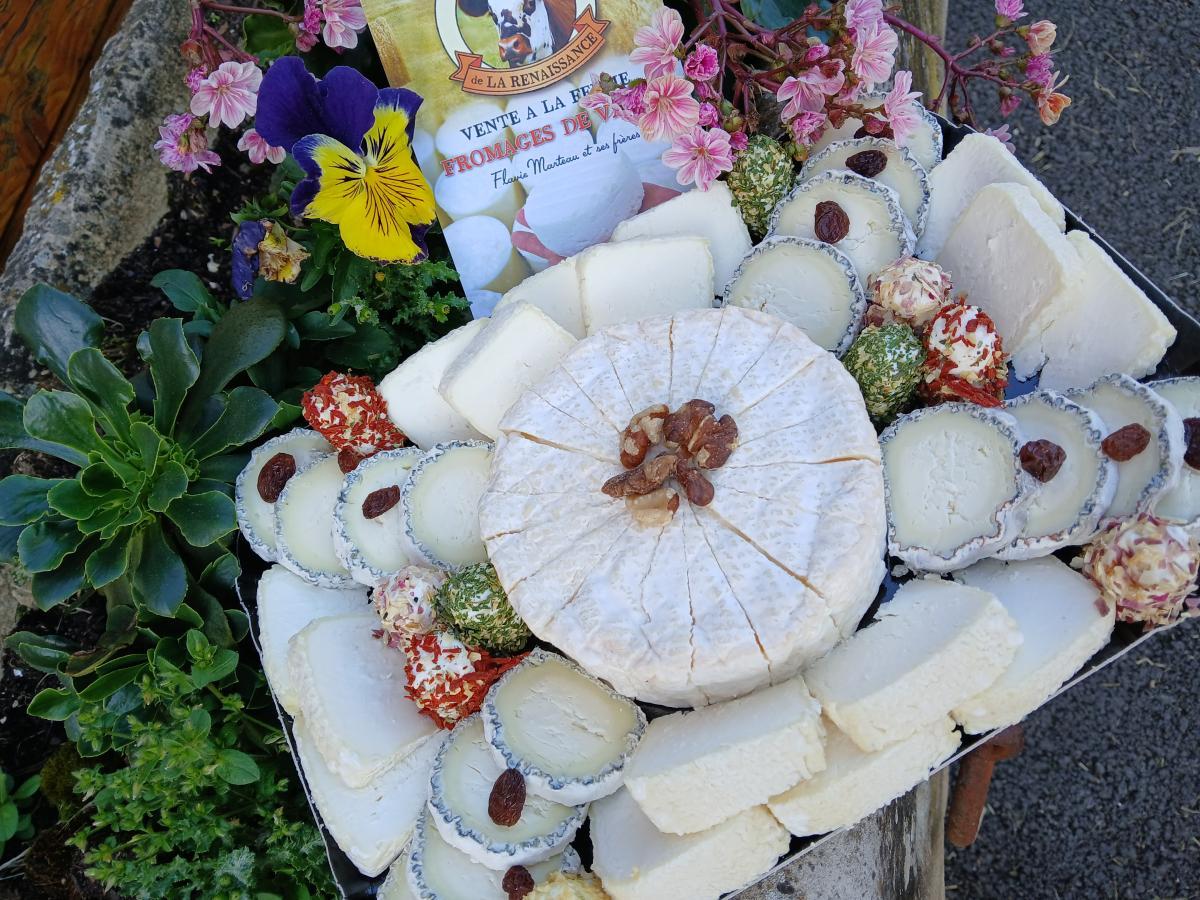 Plateau de fromage ou pour l'apéritif. Contient bûche de Puisaye affinée, Camembert de Puisaye, fromage de vache demi sec et aperi'vaches frais ails et fines, échalote, oignon et bruscheta.