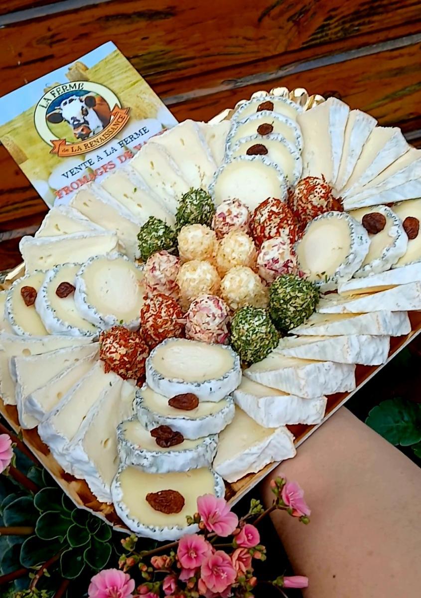 Plateau de fromage ou pour l'apéritif. Contient bûche de Puisaye affinée, Camembert de Puisaye et aperi'vaches frais ails et fines, échalote, oignon et bruscheta.
