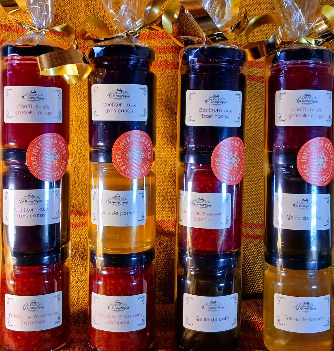 Différentes confitures sont assemblées de manière aléatoire : Framboise-verveine citronnée, framboises au beurre, casseille au combawa, feijos de Sicile, gelée de pomme, … C'est la surprise !